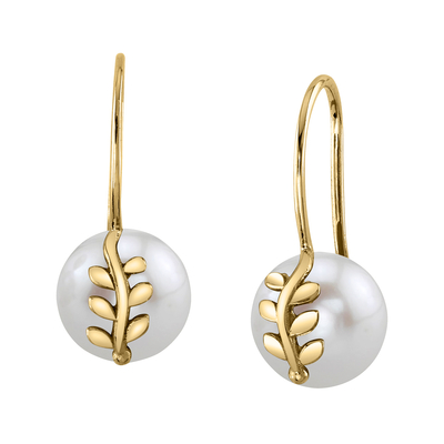 These classic pearl earrings feature two 8mm AAAA quality Freshwater pearls, handpicked for their incredible luster. The pearls are mounted on the finest 14K gold leaf-like design.