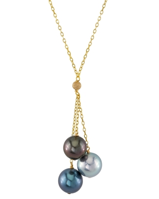 This chic pearl pendant necklace features 8-9mm AAA quality multicolor tahitian pearls hand picked for their incredible luster. The three pearls are mounted, with a dazzling gold filled round ball, on a 14K gold chain and affixed with a spring clasp.