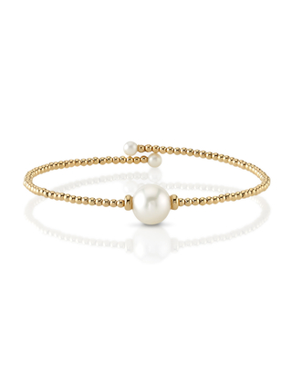 Effortlessly radiant, our 14K Gold White Freshwater Pearl Beaded Bangle Bracelet centers an 8mm AAAA-quality pearl in a sleek, modern silhouette. Delicate 3mm pearls accent each side, lending balance and quiet brilliance.