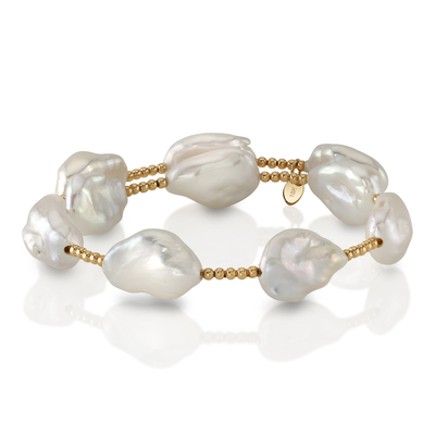 This chic bangle pearl bracelet features nine 9mm white baroque freshwater pearls. The pearls are mounted on the finest 18K gold bangle bracelet, with your choice of white gold or yellow gold. The bangle comes in a standard one size fits all. This item comes packaged in a beautiful jewelry gift box, perfect for gifting.