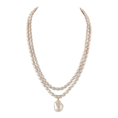 This 4.5-5.0mm oval white freshwater double strand pearl necklace is certain to grab the attention of anyone who sees this beauty. This pearl necklace is compiled of two strands of hand picked oval white freshwater pearls with high grade luster that has an exquisite 14-16mm dangling baroque pearl dangling. This necklace feature a 17" extendable to 18" Sterling silver or Yellow gold plated clasp.
