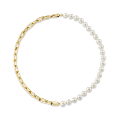 This beautiful, half chic, half trendy, pearl necklace will make a beautiful and unique addition to your collection of pearl jewelry. This necklace is made with half 7mm white freshwater pearls and half Yellow Gold or White gold plated chain.
