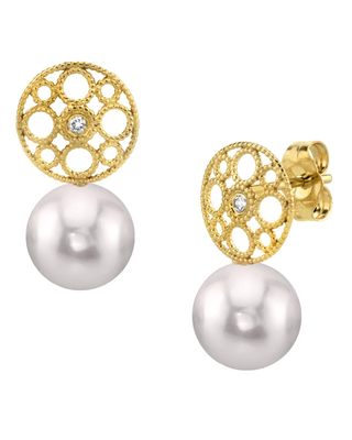 These elegant pearl earrings feature two 8.0-8.5mm AA+ quality Japanese Akoya pearls, handpicked for their incredible luster and overtones. The pearls are mounted on the finest 14K gold with dazzling SI clarity diamonds. The approximate height for each earring is 0.75 inch.