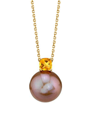 This beautiful pearl pendant features a lustrous 10mm AAA quality Pink Freshwater cultured pearl hand picked for its luster and overtones. The pearl is mounted on 14K gold with a dazzling yellow citrine gemstone. This item comes packaged in a classic jewelry box, perfect for gifting.