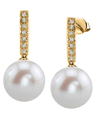 These exquisite pearl earrings are a favorite at The Pearl Source for its romantic look. These gorgeous 14K white gold pearl earrings have two beautiful 9mm AAAA quality Freshwater pearls with 'Very High' grade mirror luster. Two gorgeous pieces with 7 sparkling diamonds on each earring adorn this romantic piece which exhibits the finest color and quality in freshwater pearls. Matching pendant is also available to complement these gorgeous pearl earrings.
