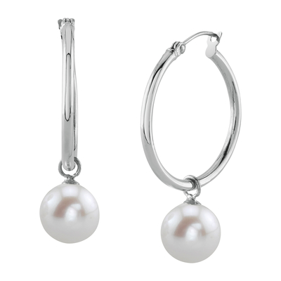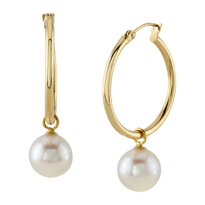 A beautiful pair of 8-9mm freshwater cultured hoop pearl earrings with gorgeous 14K gold mountings. Our freshwater pearls come directly from the pearl farms of China. These pearl earrings are AAAA quality with mirror luster (please see our pearl grading section for more information). These pearl earrings are mounted on a 14K White and Yellow gold hoop. All pearl earrings are approved by our staff of GIA pearl experts and come packaged in a beautiful pearl jewelry box. Please view the options below to customize your pearl earrings to your specifications. These earrings are approximately 1 inch in height including the pearl.