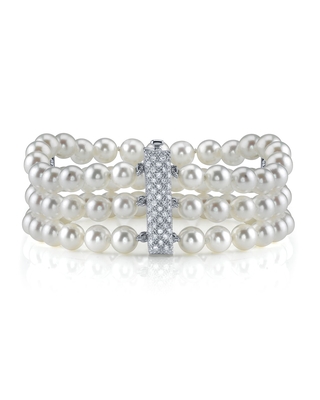 Hanadama, meaning Flower Pearl, represents the highest quality available in Japanese Akoya Pearls, certified by the Japan Pearl Science Laboratory. This triple white Hanadama akoya pearl bracelet is certain to grab the attention of anyone who sees this beauty. The clasp is completely covered and paved in diamonds with over 1 carats worth of high quality SI1 diamonds. The standard bracelet comes with 7.5-8.0mm pearls, but you can customize your bracelet to have larger pearls if necessary. All of our pearl bracelets are made on site, and our experienced staff of GIA certified specialists pay careful attention to all pearls in order to create a truly beautiful piece. The pearl bracelet is strung and double-knotted with silk thread and comes in a beautiful pearl jewelry gift box.