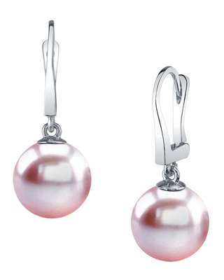 These earrings feature two lustrous pink freshwater pearls in AAAA quality. These lovely pearls dangle from 14K gold backings on your choice of white or yellow gold.