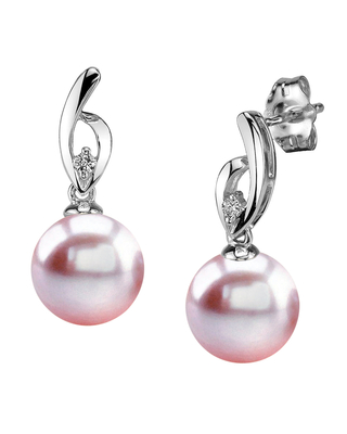 These exquisite pearl earrings feature two 8mm AAAA Quality pink Freshwater pearls, hand-picked for their incredible luster and overtones. The pearls are mounted on the finest 14K gold with dazzling .02 Carats SI clarity diamonds.