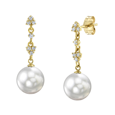 These exquisite earrings feature 9mm high quality White South Sea pearls, handpicked for their incredible luster and overtones. The pearls are mounted on the finest 14K gold with dazzling lab grown diamonds. These earrings come packaged in a beautiful jewelry gift box, perfect for gifting.