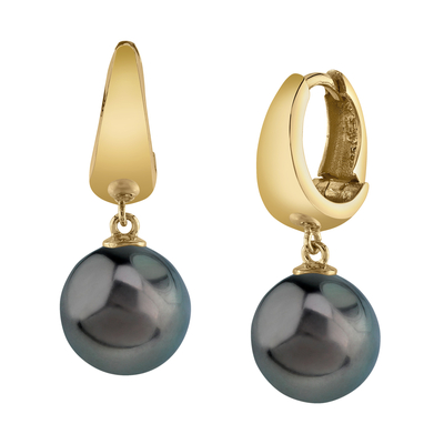 A beautiful pair of 11mm Tahitian South Sea cultured hoop pearl earrings with gorgeous 14K gold mountings. Our Tahitian pearls come directly from the pearl farms of French Polynesia. Please view the options below to customize your pearl earrings to your specifications. These earrings are approximately 1 inch in height including the pearl.