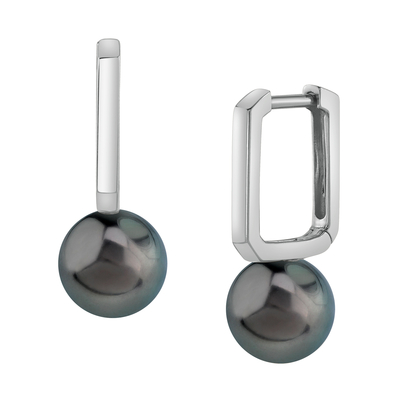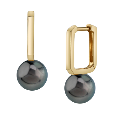 A beautiful pair of 8mm Tahitian South Sea cultured pearl huggie earrings with gorgeous 14K gold mountings. Our Tahitian pearls come directly from the pearl farms of French Polynesia. Please view the options below to customize your pearl earrings to your specifications. These earrings are approximately 1 inch in height including the pearl.