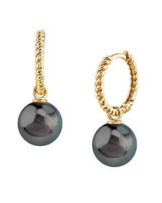 These elegant pearl hoop earrings feature two 8-9mm AAA quality Black Tahitian South Sea pearls, handpicked for their incredible luster and overtones. The pearls are mounted on the finest 14K Gold. Approximate height for each earring is 1 inch.
