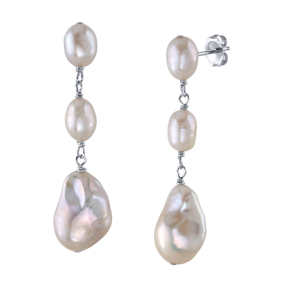These exquisite triple pearl earrings add a touch of elegance to any occasion. These earrings feature three lustrous 6-13mm AAA quality Baroque White Freshwater pearls, hand picked for their gorgeous luster. The pearls are mountings on a sterling silver or Yellow Gold Plated triple dangling base.