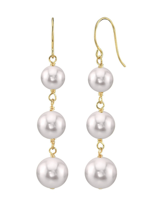 Simplicity and elegance have never made such a perfect combination. A beautiful set of Japanese Akoya triple pearls on an elegant 14K white gold chain. The earrings fall appx. 1.25' below the ear with high quality Akoya pearls. The pearl earrings have 'Very High' grade luster, our highest category available in Akoya. Each Pearl is designed to compliment the next arranged in ascending order 6mm-7mm-8mm in size.