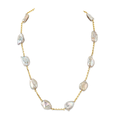 This beautiful pearl necklace would be the perfect gift for any occasion. The necklace features AAA Quality, 11-12mm various Keshi baroque-shaped Freshwater pearls, hand picked for its gorgeous luster and overtones. The pearls are standing on an 18 inch 925 sterling silver or Yellow Gold plated chain. All products come packaged in a beautiful jewelry box with a genuine cultured pearl guarantee.