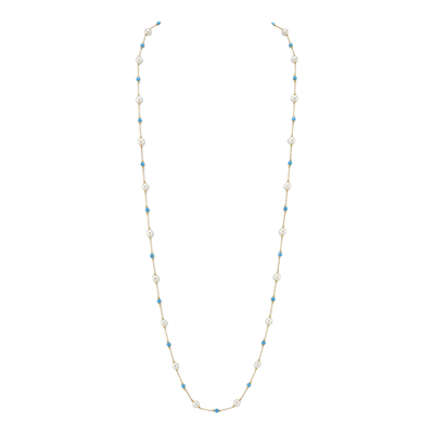 This Freshwater tincup necklace measures 35 inches and consists of 6.06.5mm pearls with 3.54.0mm natural turquoise nuggets on a sterling silver or yellow gold plated chain. Pair it with the matching earrings to complete the look.