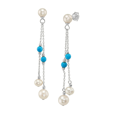 These chic Freshwater pearl earrings feature 3 pearls ranging from sizes 4.5-6.5mm hand picked for their incredible luster with natural turquoise nuggets. Available in sterling silver and yellow gold filled. Pair these with the matching necklace to complete the look. These earrings come packaged in a beautiful jewelry gift box, perfect for gifting.