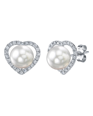 These elegant heart pearl earrings feature two 8.0mm AAA quality White South Sea pearls, handpicked for their incredible luster and overtones. The pearls are mounted on the finest 14K gold with dazzling SI clarity diamonds.